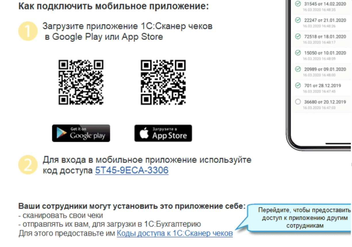 Для этого используется мобильное приложение 1С:Сканер документов, которое сканирует QR-код чека и отправляет данные в 1С:РПД. При этом система проверяет подлинность чека через ФНС, что исключает подделки.